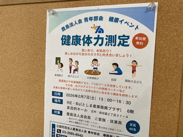 豊島法人会開催の健康イベントに参加してきました! 若い方が多く少々気後れしましたが、とても楽しいイベントでした。 数十年ぶりに反復横跳びをやりましたが、飛び方をすっかり忘れておりました。 前に進むことはあっても横に跳ねることって日常生活ではあまり無いですよね。 自分の体力があるのか無いのか、まだまだ軽快に動くのか、同年代の中では どうなんだろ~、と言うことが分かり良い機会でした。 自分の体力を過信せず、怪我が無いように運動していきたいですね。