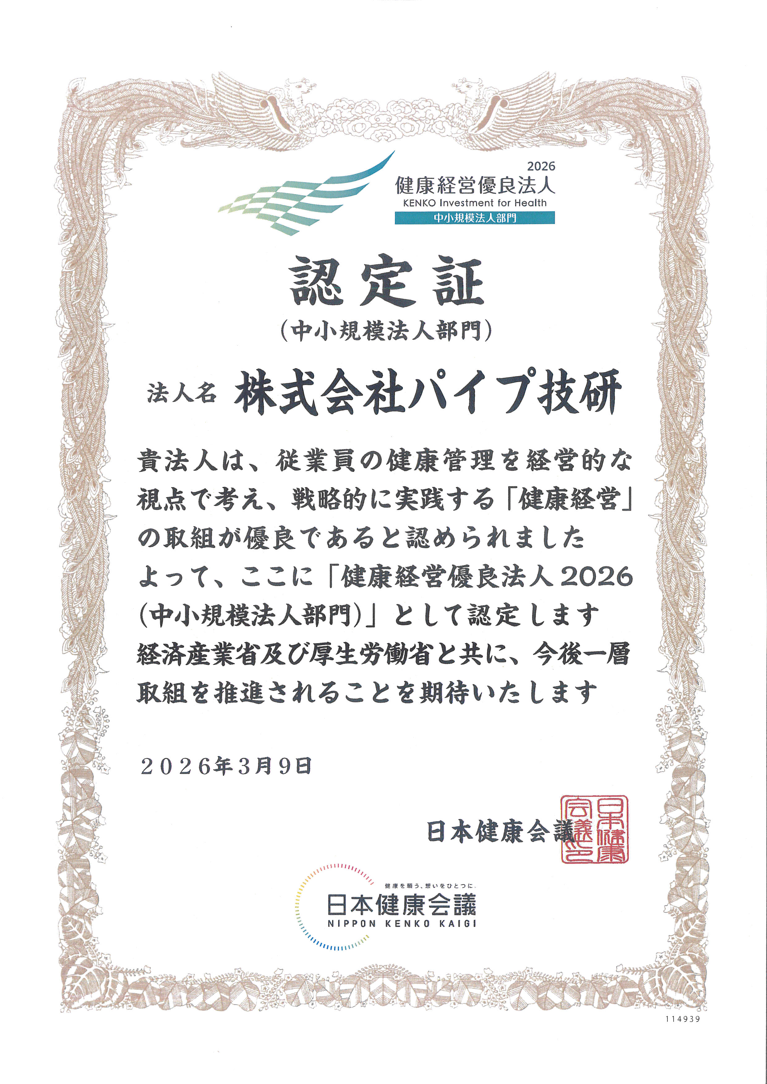日本健康会議健康経営優良法人認定事務局より健康経営優良法人2026 の認定を取得しました。